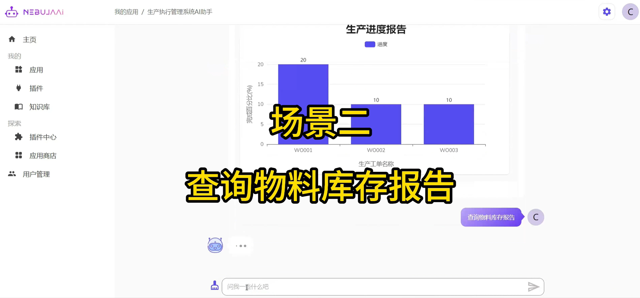 将 MES 系统的 API 接入到 NebulaAI 生成专属 MES 智能助手(如下图)。随时随地,想问就问,问啥答啥,您只需要说说话,NebulaAI 就帮您把事儿给办了。