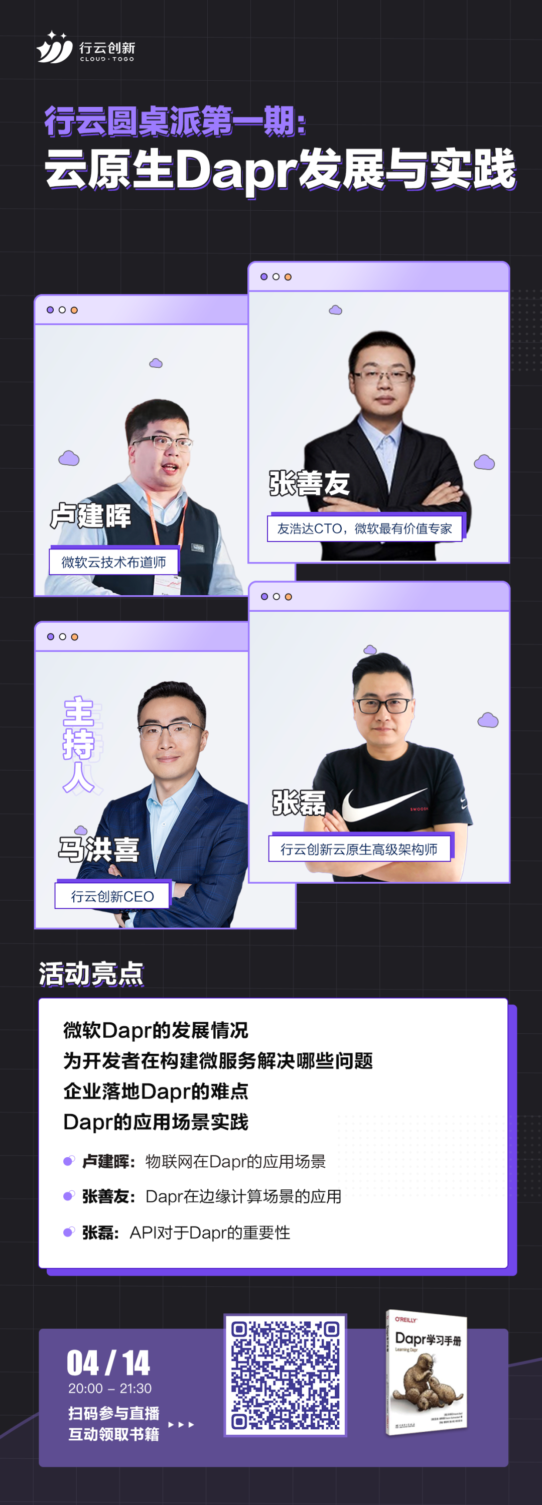4月14日晚上8点,《行云圆桌派第一期:云原生Dapr的发展与实践》直播来啦!活动由米兰milan创新CEO马洪喜,微软最有价值专家、.NET技术专家张善友,微软云技术布道师卢建晖,米兰milan创新云原生架构师张磊四位嘉宾与大家聊聊Dapr的发展情况和落地遇到的问题、Dapr应用场景实践、未来展望等。