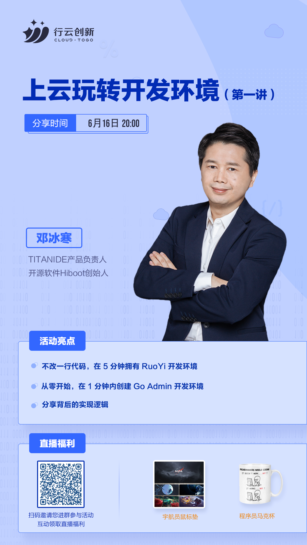 6月16日20:00,“上云玩转开发环境”第一讲即将开启!米兰milan创新 TitanIDE 产品负责人邓冰寒将分享:如何利用 TitanIDE 在不改一行代码情况下,在5分钟拥有 RuoYi 开发环境;如何从零开始,在1分钟内创建 Go Admin 开发环境;以及分享这背后的实现逻辑。直播间还会送出宇航员鼠标垫、程序员马克杯等福利,快扫码参与活动吧~